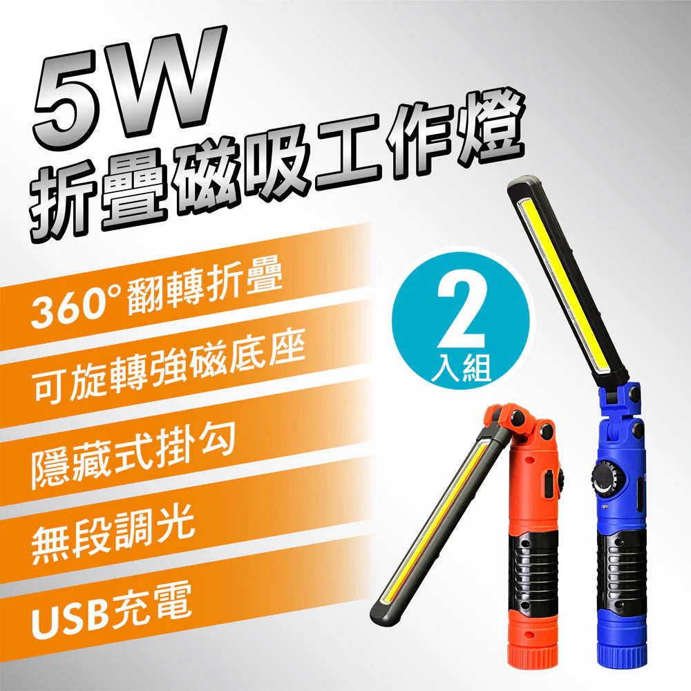5W可摺疊磁吸COB LED工作燈手電筒 白光+警示燈/白光 2入組 (BI-LW-F05(DB))