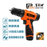 12V鋰電無碳刷震動電鑽,高性能無刷馬達,含高/低速檔位,可依工作需求自由切換。20段扭力調節及無段變速開關,搭配2顆2.0Ah鋰電池。