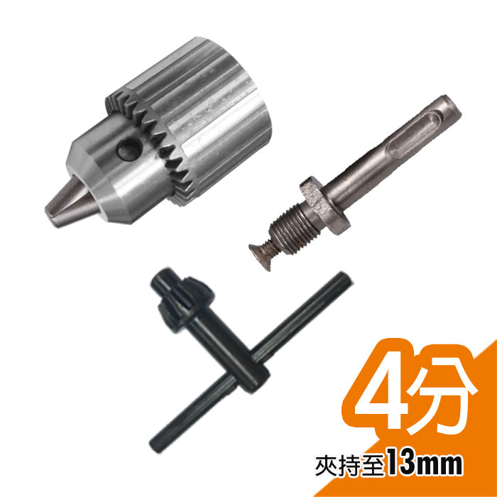 • 4分鋼夾頭組,1/2"電鑽夾頭附SDS四溝接桿,實心全鋼材,適用於四溝免出力電鎚鎚鑽轉三爪夾頭