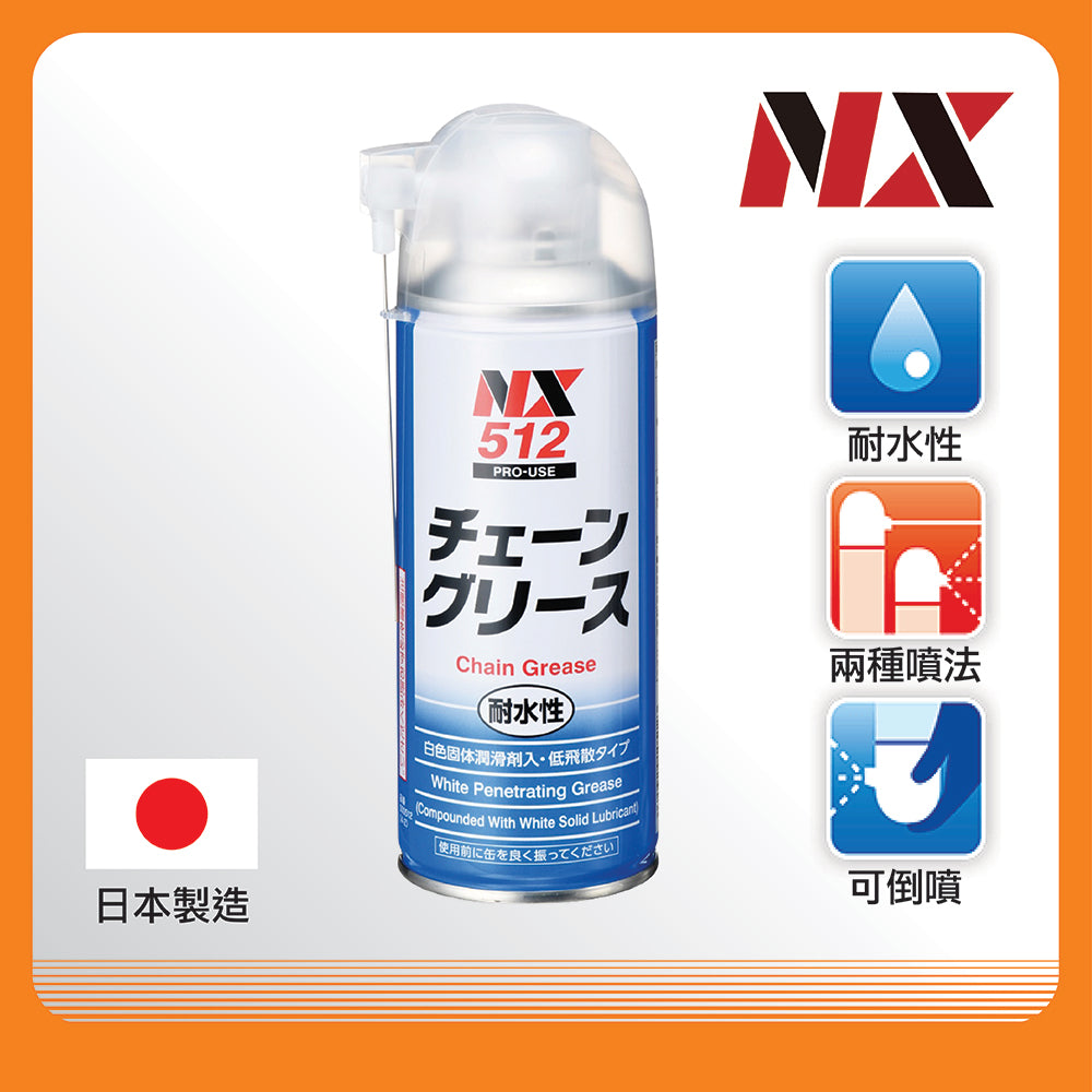 單價 / 每日本原裝進口株式会社イチネンケミカルズ (ICHINEN CHEMICALS CO.,LTD.) NX512乾式鍊條油,耐水性極壓鏈條潤滑劑,是白色極壓滲透潤滑油脂(帶有白色固體潤滑劑),具有優越性的耐水性及密著性,潤滑防銹效果一級棒。