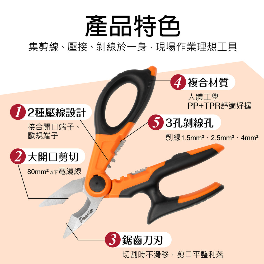 Unit price / per專為電工設計的專業多功能剪刀,日本不鏽鋼打造,剪切力強,能應對80mm²電纜。附專屬護套,方便腰掛攜帶。集剪線、壓接、剝線等多種功能於一身,是現場作業的理想工具!
